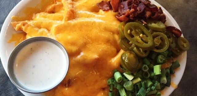 After you’ve looked around, been overly impressed with the attention to detail and décor, you’re definitely going to order the Kenny’s Loaded Cheese Fries! It’s something on the menu everyone talks about and insists is a must try! A generous plate of fries topped with cheddar cheese, bacon, jalapenos, and chives with a side of ranch is large enough to share with the table.